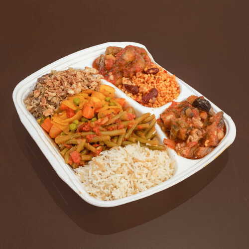 Lamsbrochette, kipbrochette, köfte, salade met friet of rijst.
